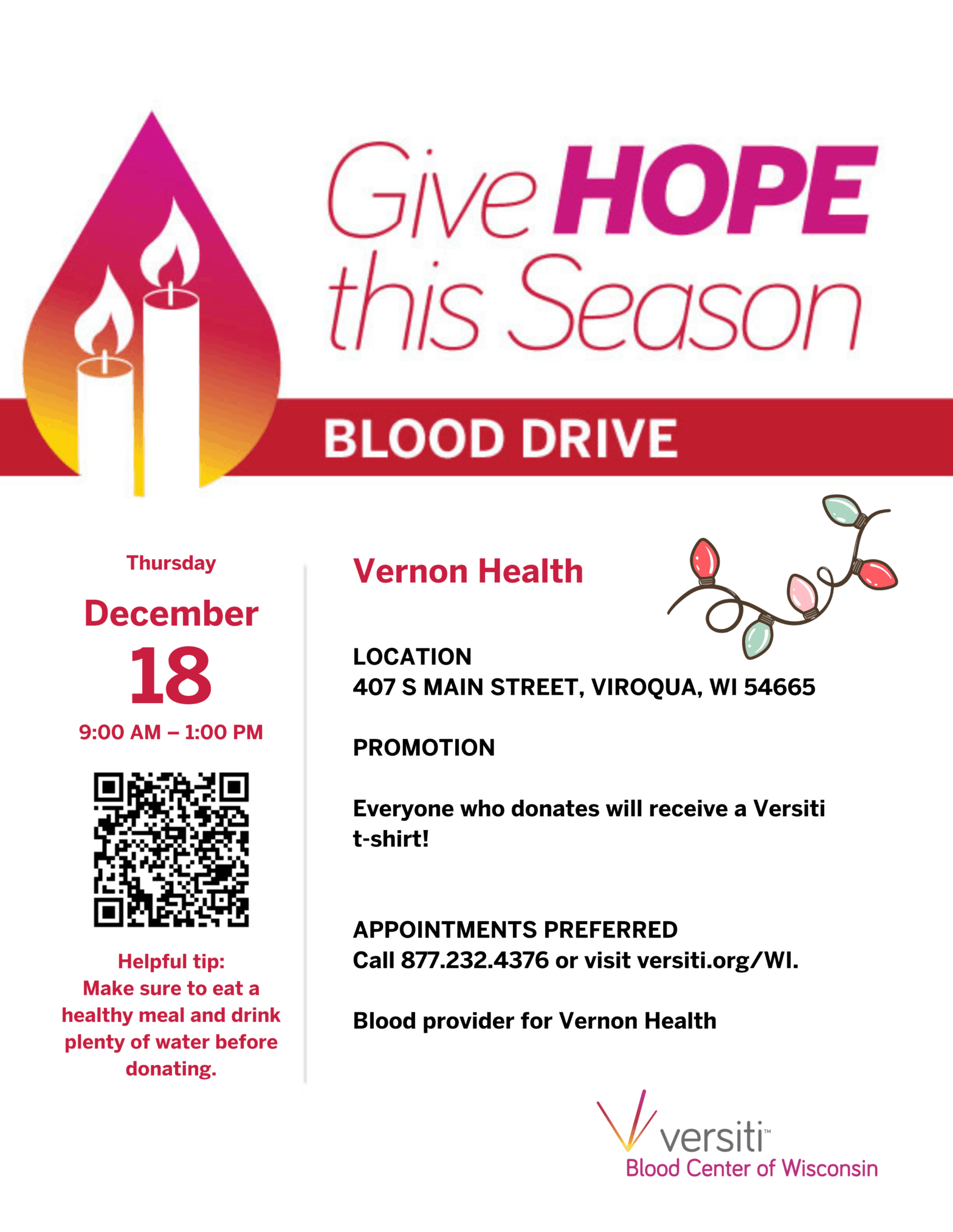 Vernon Health is proud to partner with Versiti for an upcoming community blood drive. Your donation can make a lifesaving difference for patients across our region. Join us in supporting… Continue reading Blood Drive